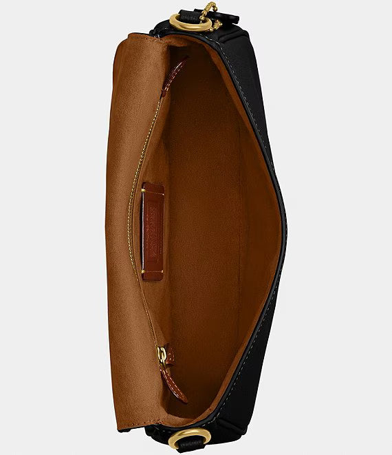 • Brass-tone exterior hardware, open pocket; interior zip pocket