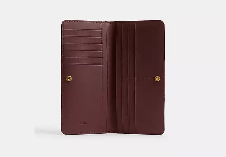 This elegant wallet combines functionality with timeless design. Crafted in signature coated canvas with refined leather accents, it features an exterior zip coin pocket, twelve card slots, and full-length bill compartments for easy organization. The snap closure ensures everything stays secure, while its spacious interior fits most phone sizes, including an iPhone X and Samsung S7 Edge — making it the perfect everyday accessory for style and practicality.