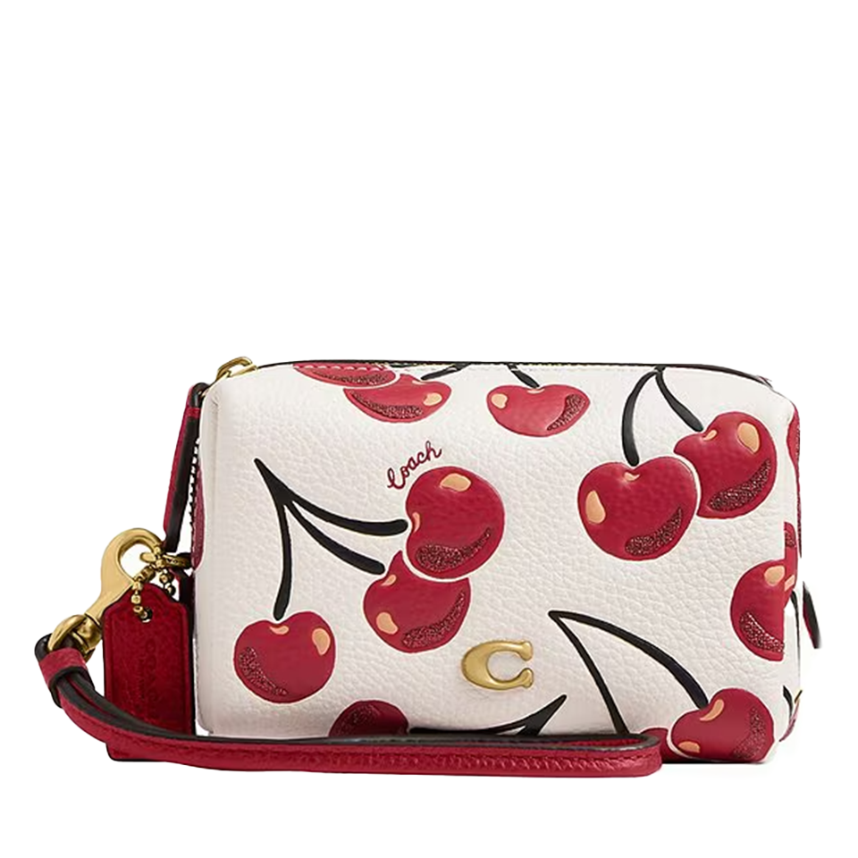 This playful Coach crossbody bag features a lively cherry print on smooth white leather, bringing a fun and youthful touch to any look. Accented with red leather trim and gold-tone hardware, including the signature “C” logo, it perfectly balances charm and sophistication. The compact design includes a detachable strap, allowing it to be worn as a crossbody or carried as a clutch for versatile styling.