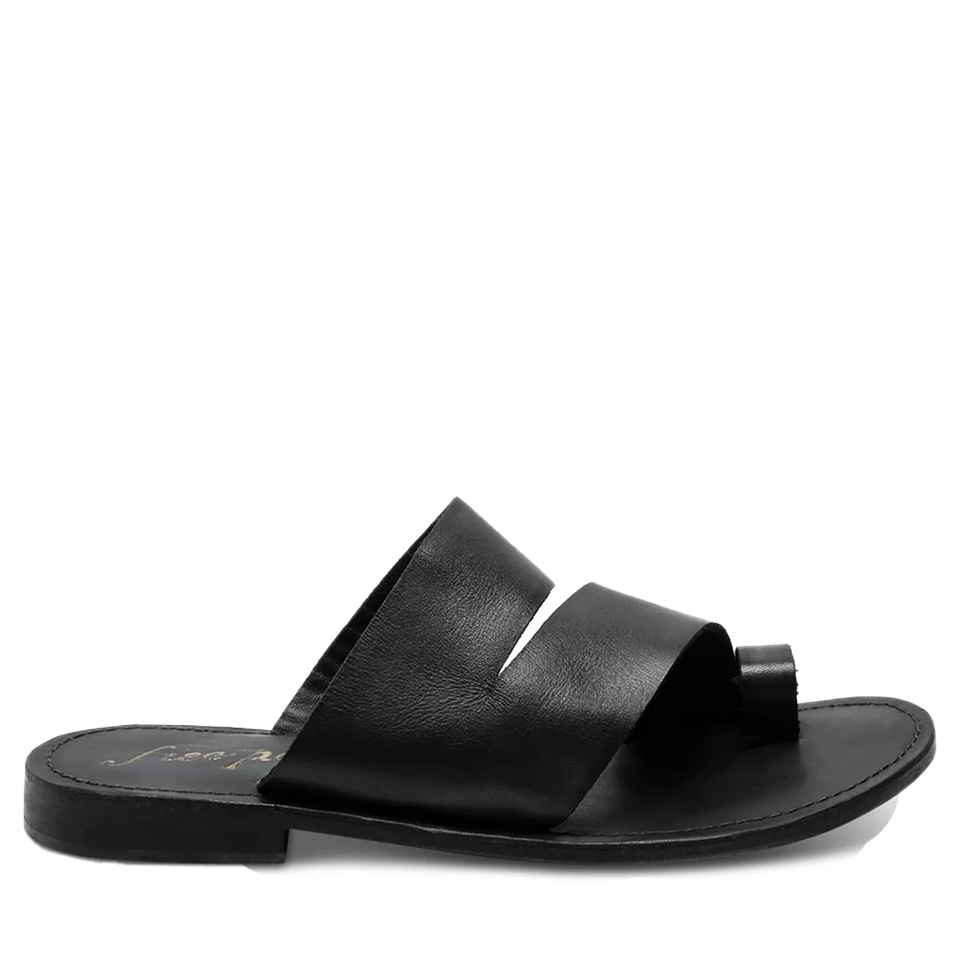 - Flat leather sandal with a timeless, minimalist design